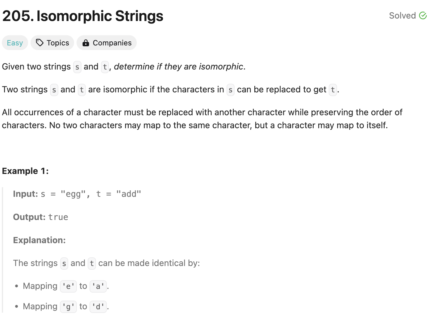 두 개의 문자열 s, t가 동형(isomorphic)인지 확인하는 문제. s에 존재하는 문자를 가지고 t를 만들 수 있으면 두 문자열 s, t는 동형이다. 단, 문자의 순서를 유지하며 모든 문자를 다른 문자로 바꿀 수 있어야한다. 두 문자가 같은 문자로 맵핑되어서는 안된다.